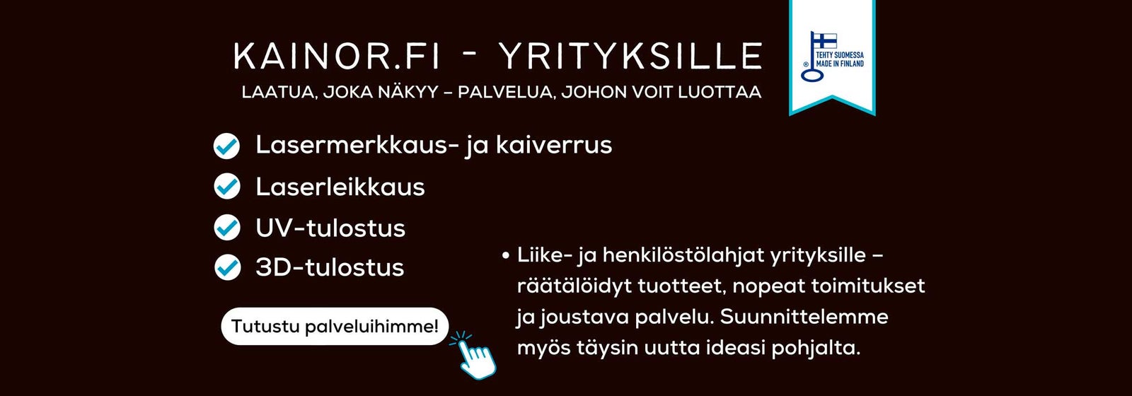 Lappeenrannan Uus-Lavolassa toimiva Kainor tarjoaa laserleikkaus-, UV- ja 3D- tulostuspalveluja, sekä valmistaa omia tuotteita kotimaisuus ja ekologisuus toimintaa ohjaavina arvoinaan.