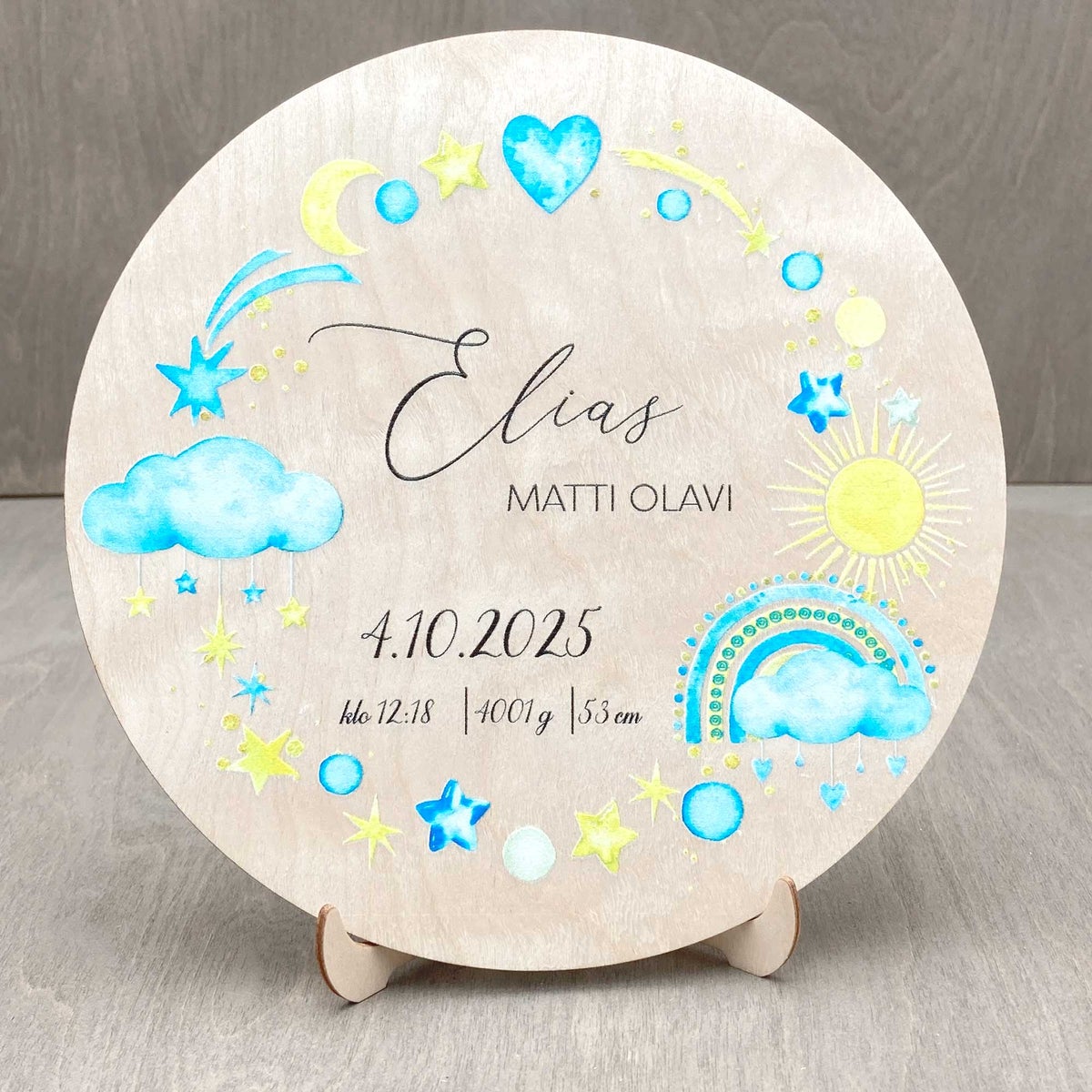 Syntymätaulu on erinomainen lahja vastasyntyneelle tai ristiäisiin. Lisäksi sitä voi käyttää rekvisiittana kuvauksissa, joten se on monipuolinen hankinta.